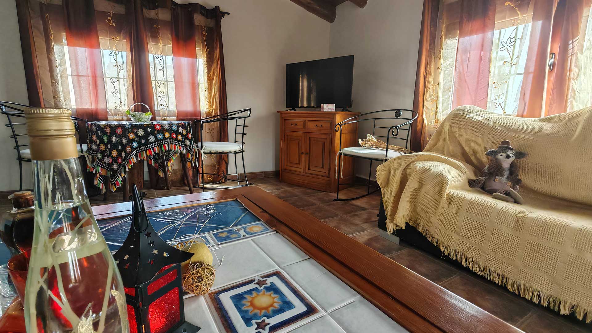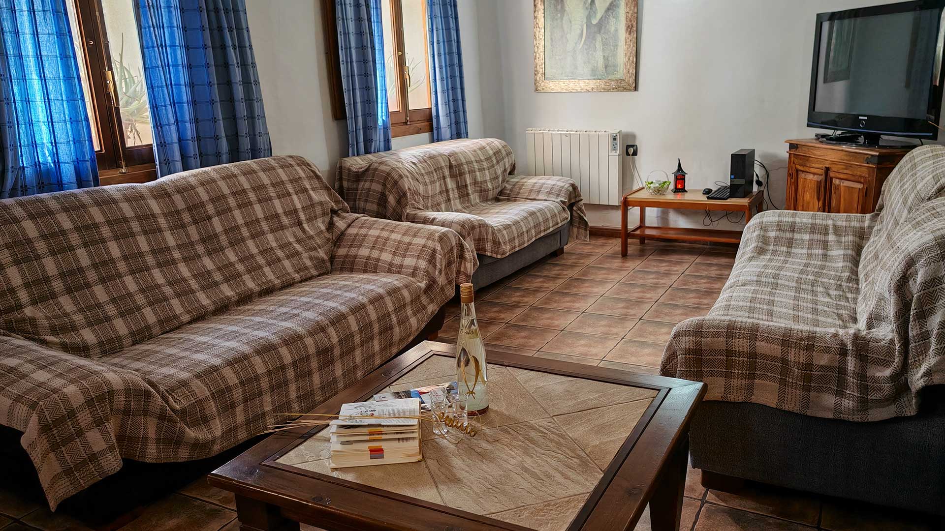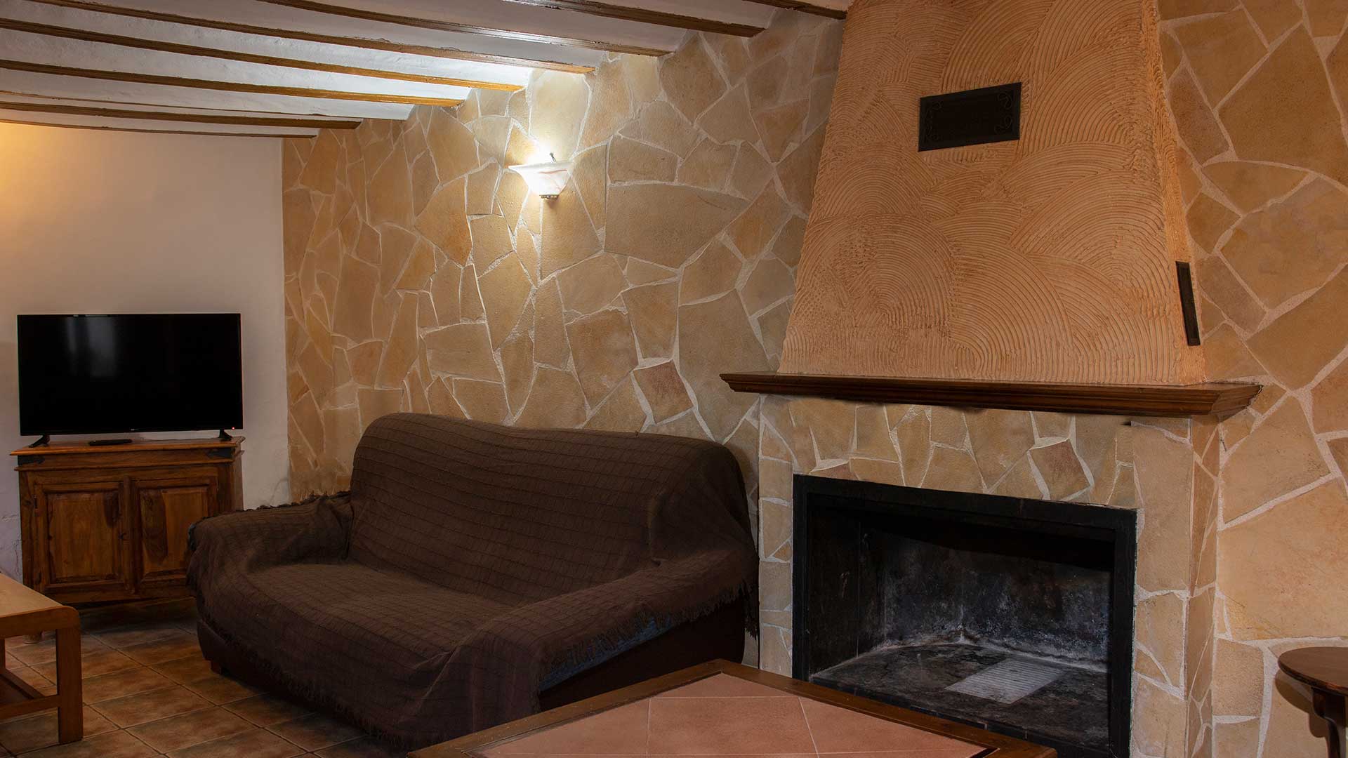 Una cocina completamente equipada, diseñada para grupos de más de veinte personas, donde es posible cocinar y compartir las comidas en un mismo espacio de forma cómoda y organizada. El ambiente combina el encanto tradicional de la chimenea —con dos sofás situados frente a ella— con todas las comodidades actuales: frigorífico, lavavajillas, horno eléctrico, microondas, tostadora, batidora y un menaje amplio y completo para todos los huéspedes. Un espacio concebido para fomentar la convivencia, el disfrute gastronómico y la vida en común durante la estancia. Junto a la cocina se encuentra un baño completo y una de las dos salas de estar, lo que convierte esta zona en un espacio especialmente funcional y cómodo para el grupo. Todas las estancias cuentan con calefacción y acceso gratuito a wifi.